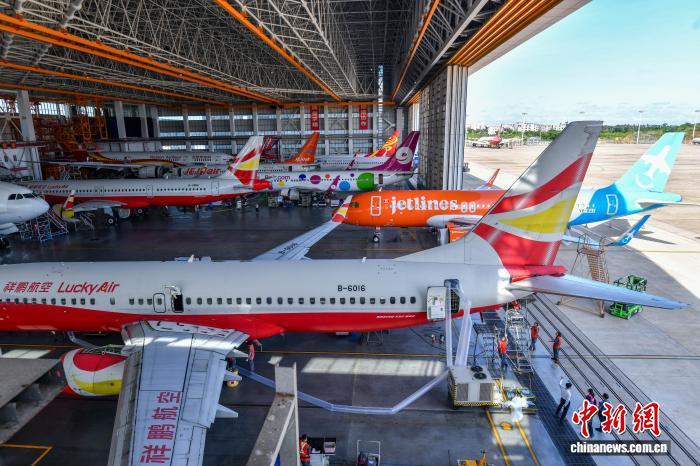 圖為多架進(jìn)境維修飛機正在海南自貿(mào)港一站式飛機維修產(chǎn)業(yè)基地內(nèi)進(jìn)行全面檢修。 中新網(wǎng)記者 駱云飛 攝