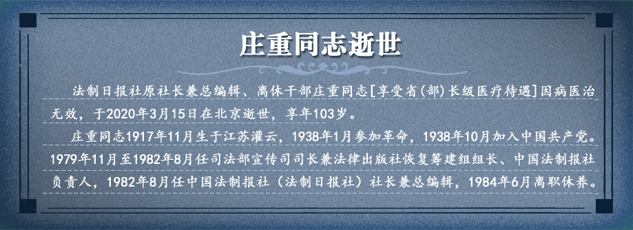 莊重老社長(zhǎng)逝世,我很悲慟。悲慟之余,他在法制報(bào)創(chuàng)辦初期的感人事跡浮現(xiàn)在我的腦海中。 1979年,中央組織部向在京各部委發(fā)文,要求抽調(diào)一批干部支援公安部、最高檢、最高法、司法部、民政部、安全部。莊重同志于1979年11月調(diào)入司法部,分配在宣傳司為負(fù)責(zé)人,同時(shí)領(lǐng)導(dǎo)籌備法制報(bào),這時(shí)宣傳司與法制報(bào)為同一個(gè)單位,兩年后分開(kāi)。分開(kāi)時(shí)莊重為宣傳司司長(zhǎng)、法制報(bào)社黨委書(shū)記、社長(zhǎng)、總編輯,一時(shí)身兼四職,可見(jiàn)人氣十足。【詳細(xì)】
