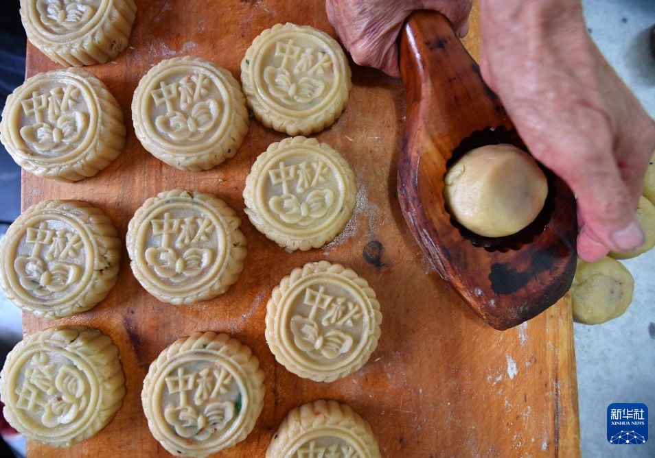 9月20日,在河北省石家莊市井陘縣天長鎮(zhèn)的一家手工月餅作坊里,老師傅使用傳統(tǒng)手藝制作月餅……