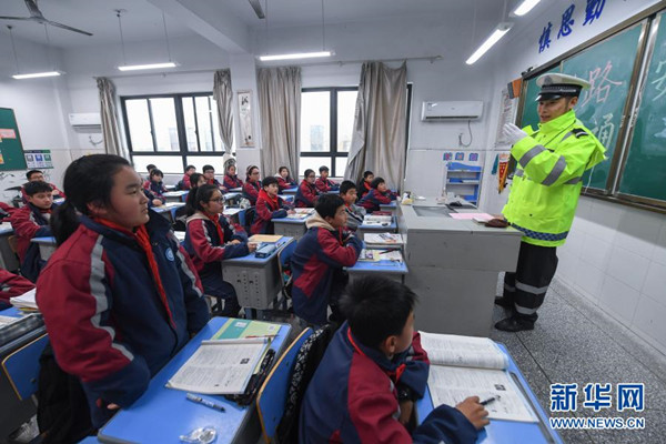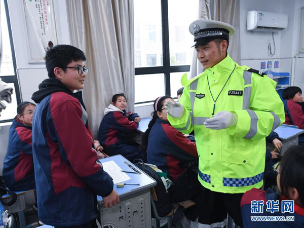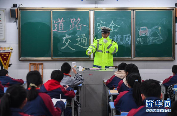 3月16日,湖州市交警支隊東林中隊的輔警給東林中學的學生上交通安全課。新華社記者 徐昱 攝