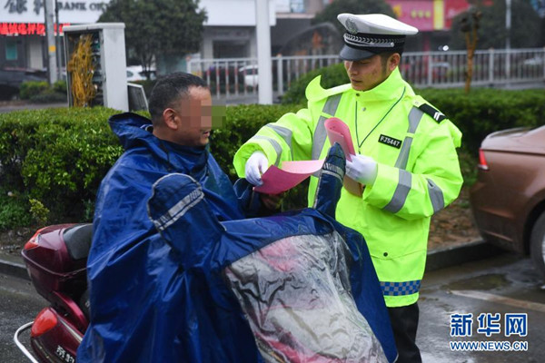 3月16日,湖州市交警支隊東林中隊的輔警在鎮(zhèn)區(qū)的十字路口勸誡非機動車駕駛者,提醒戴安全帽并遵守交通規(guī)則。新華社記者 徐昱 攝