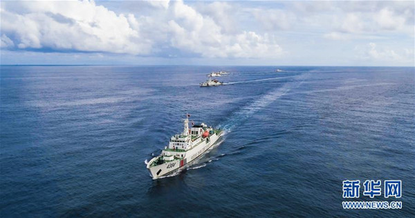 海警艦艇編隊(duì)在轄區(qū)海域巡邏(7月7日攝,無(wú)人機(jī)照片)。 新華社發(fā)
