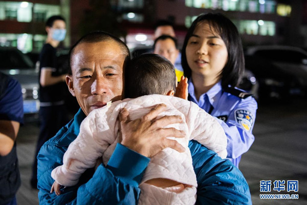 4月20日,廣東梅州警方快速行動解救一名9個月大的嬰兒。圖為解救成功后,嬰兒在家人懷抱里(4月21日攝, 廣東省公安廳供圖)。新華社發(fā)