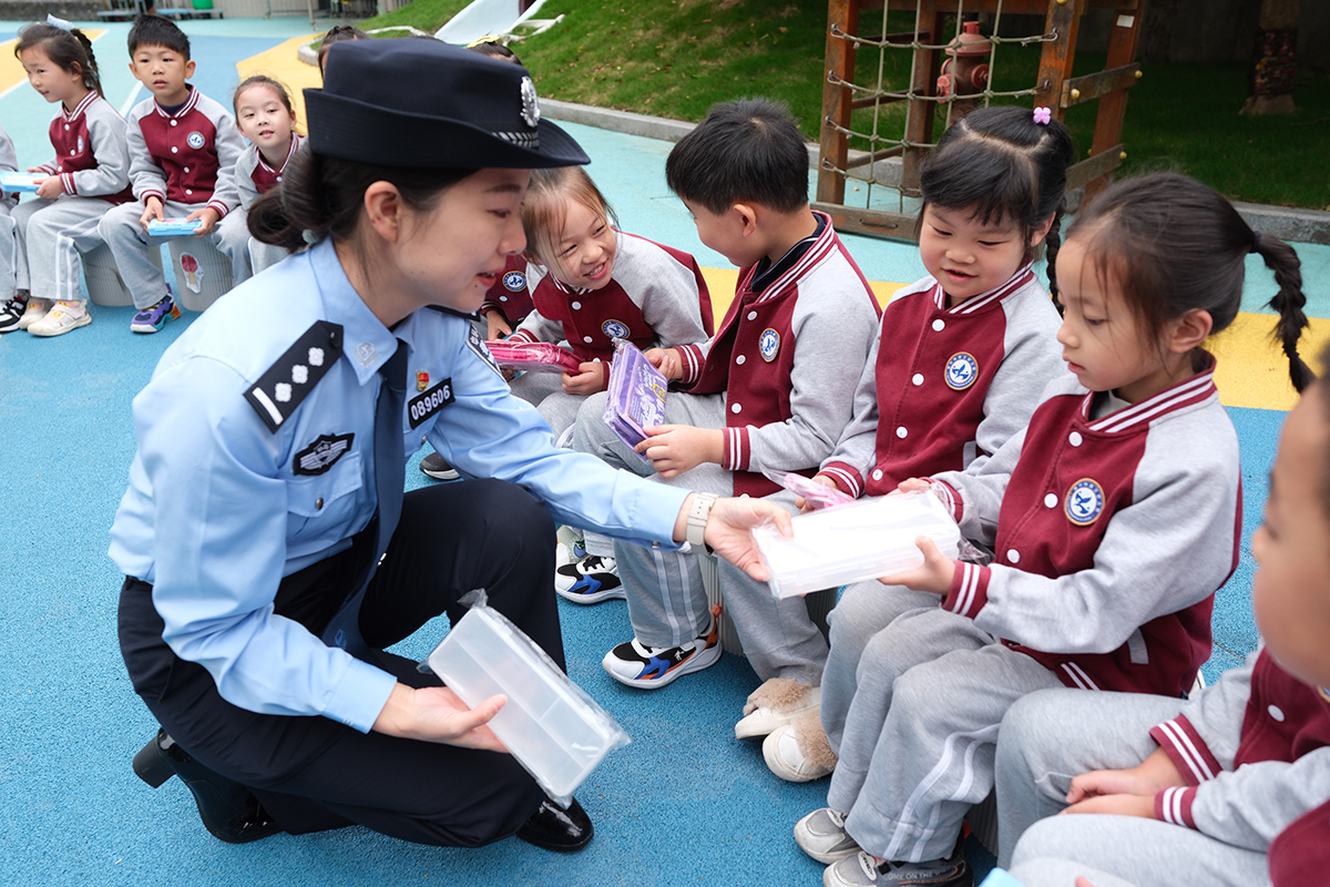 近日,杭州鐵路公安處嘉興站派出所民警組成愛路護(hù)路宣傳小分隊,來到嘉興市第三幼兒園開展安全宣傳活動。圖為民警向小朋友講解鐵路安全及乘車安全知識。 本報通訊員 賀瑞明 徐燁 攝