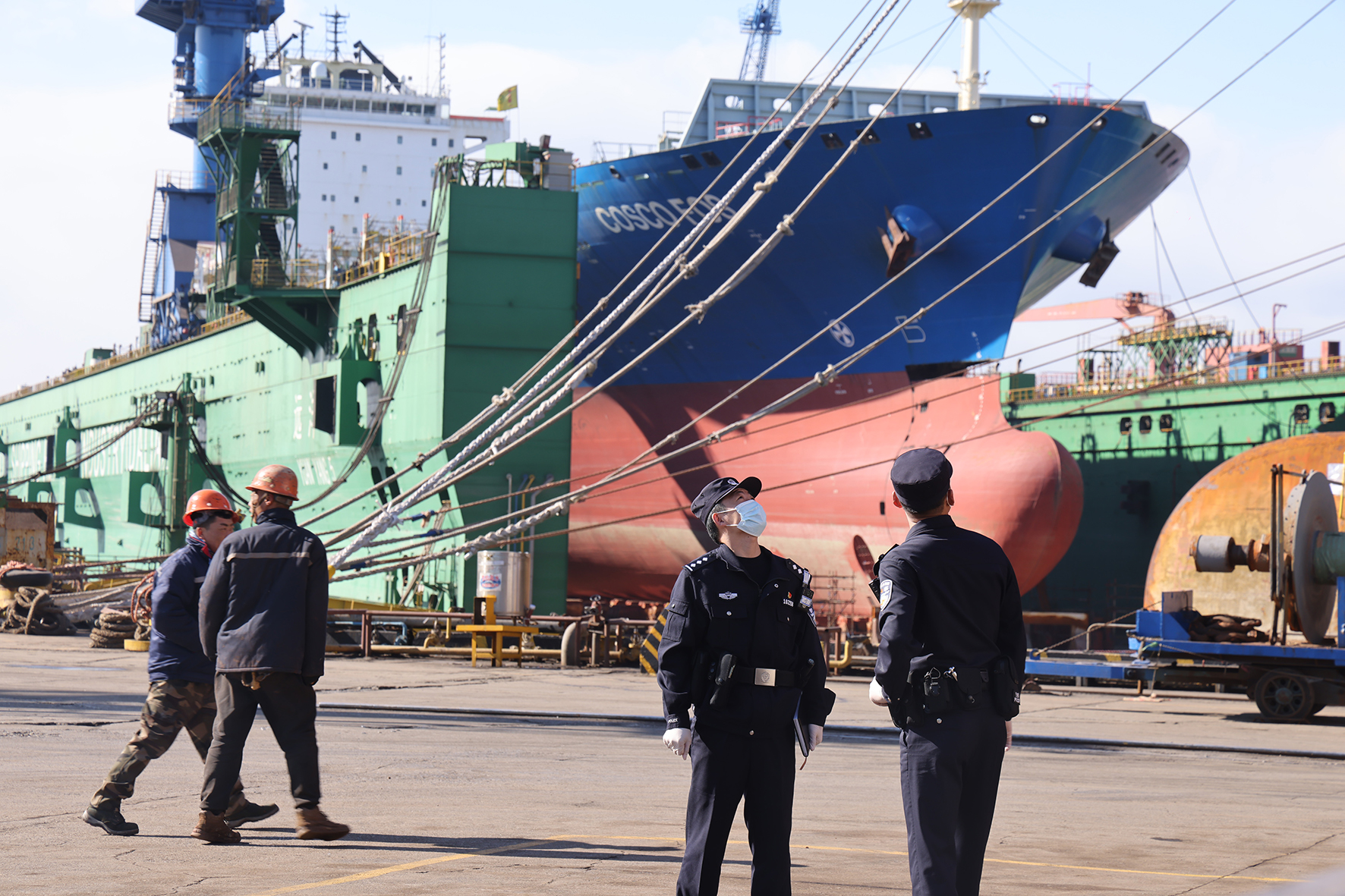 近日,遼寧大連出入境邊防檢查站出臺服務(wù)海港口岸高質(zhì)量發(fā)展十一項(xiàng)措施提升通關(guān)便利化水平,內(nèi)容包括創(chuàng)新實(shí)現(xiàn)邊檢通關(guān)進(jìn)度“一鍵直推”、開通“邊檢即時(shí)通”平臺、保障特定類型船舶“特辦快辦”等。圖為11月14日,民警走訪造船企業(yè)。