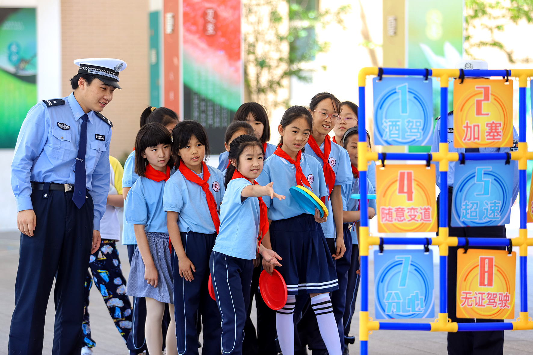 5月29日,山東省青島市公安局交通警察支隊(duì)李滄大隊(duì)民輔警來到廣水路小學(xué),舉辦“筑牢安全防線 共建平安校園”主題活動(dòng)。圖為學(xué)生通過飛盤游戲形式學(xué)習(xí)交通安全知識(shí)。