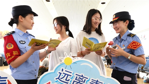 在國際禁毒日來臨之際,杭州鐵路公安處聯(lián)合客運部門開展形式多樣的禁毒主題宣傳教育活動。圖為民警在候車室向旅客發(fā)放禁毒宣傳資料。