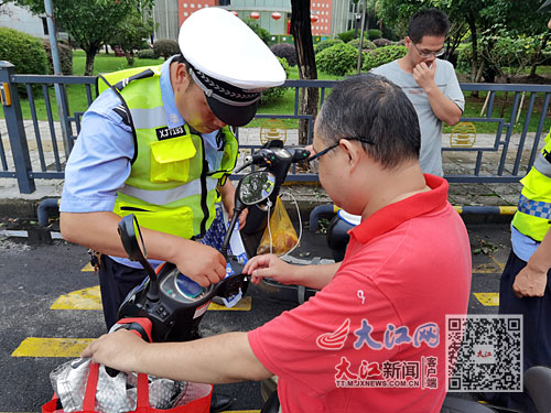 “同志,請把這張?zhí)嵝褬?biāo)簽貼在你電動(dòng)自行車的前面,時(shí)刻提醒你戴上頭盔?!?月5日,南昌市紅谷灘區(qū)鳳凰南大道上,紅谷灘交警大隊(duì)二中隊(duì)民警李黎正在勸導(dǎo)騎電動(dòng)自行車的市民佩戴頭盔。除了對未佩戴頭盔的車主進(jìn)行警示教育外,他還在每輛電動(dòng)自行車顯眼位置貼上提醒標(biāo)簽。