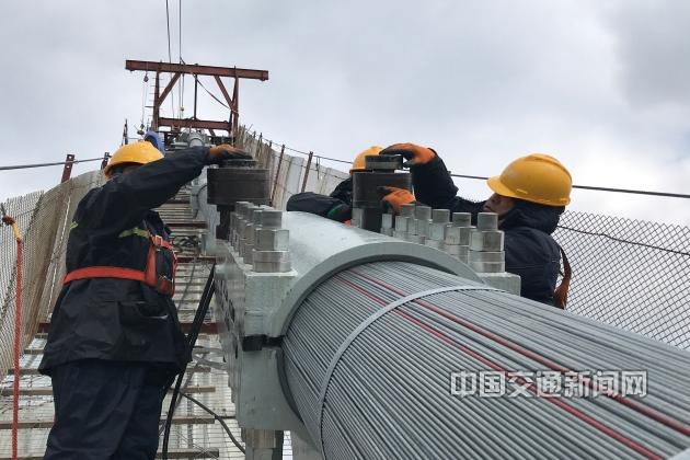 虎年伊始,由杭州市交通投資集團有限公司投資建設的京杭運河浙江段三級航道整治工程杭州段九橋路大橋項目已全面復工,工人們正在進行索夾緊固。(趙陽 鄧慧媛)