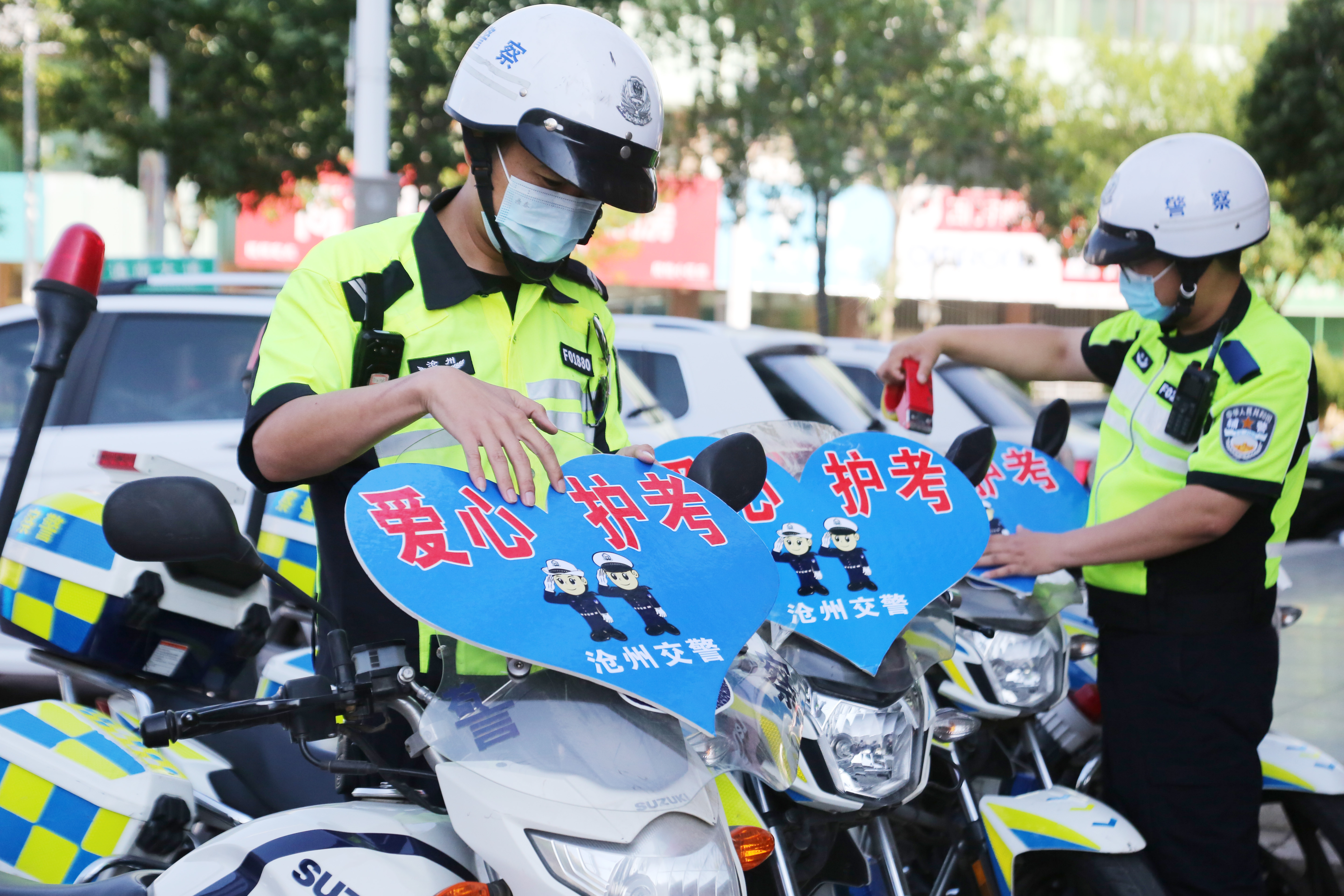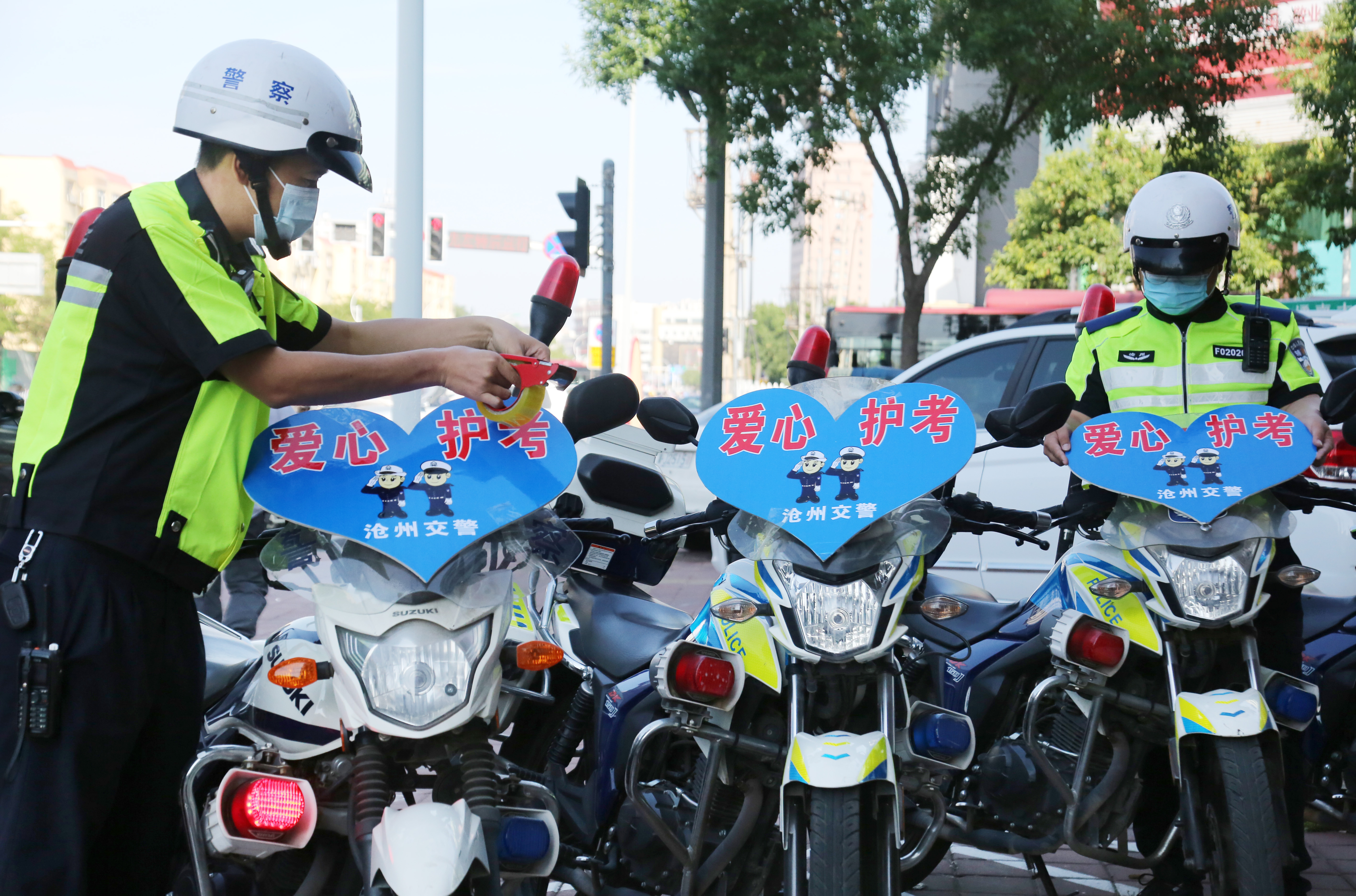 高考在即,河北省滄州市交警提前部署高考護考管控措施,參加維護高考交通秩序和護送考生車輛的執(zhí)勤交警提前進入高考狀態(tài),以良好的精神狀態(tài)為高考學子和接送考生的車輛“護航”。圖為滄州市公安交警支隊二大隊鐵騎交警提前行動,細心檢查摩托車機械運行狀況、粘貼“愛心護考”標識牌,“備戰(zhàn)”高考。