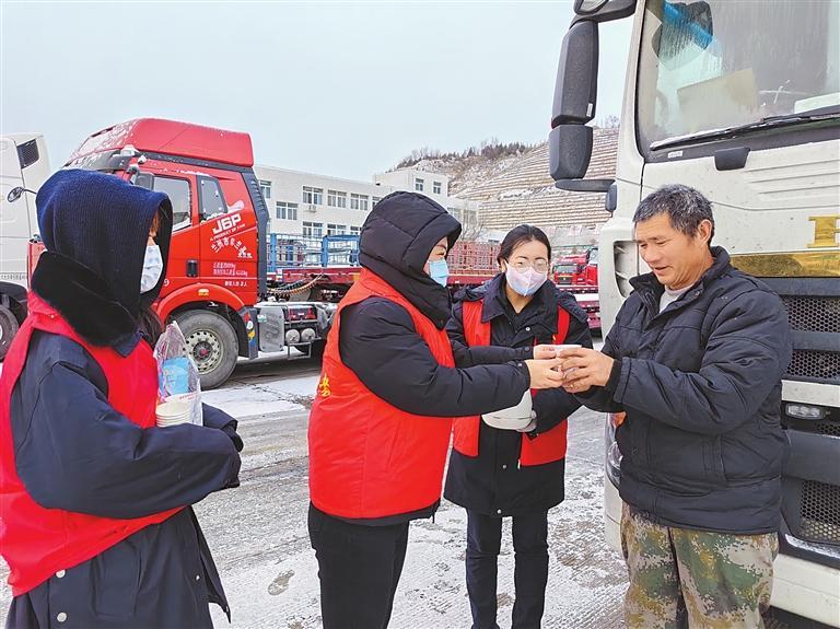 近日,甘肅省高速公路服務(wù)集團志愿者在服務(wù)區(qū)為貨車司機“送溫暖”。華運高速公路服務(wù)區(qū)管理有限公司供圖