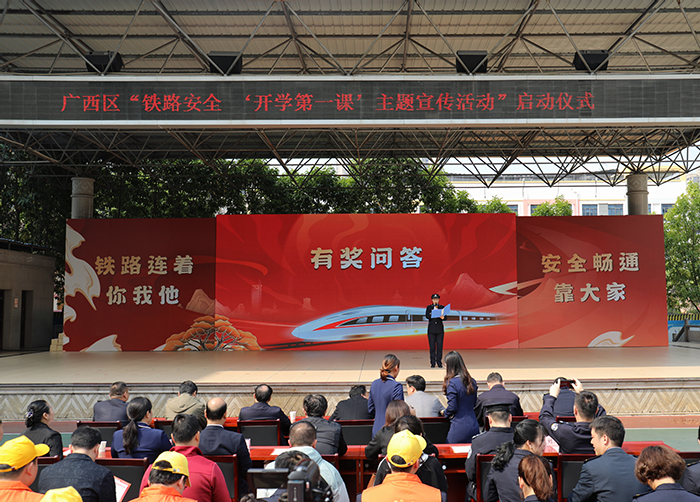 活動現(xiàn)場,錦華小學(xué)學(xué)生“紅領(lǐng)巾護(hù)路隊(duì)”代表宣讀愛路護(hù)路倡議書;學(xué)生表演《愛路護(hù)路我能行》節(jié)目,以快板和舞蹈的形式宣傳鐵路安全知識;鐵路青年志愿者通過護(hù)路快板表演,將鐵路安全小知識改編成朗朗上口的順口溜,讓人印象深刻;南寧站派出所民警上臺講解鐵路安全注意事項(xiàng),進(jìn)一步提升未成年人法律意識和安全意識。