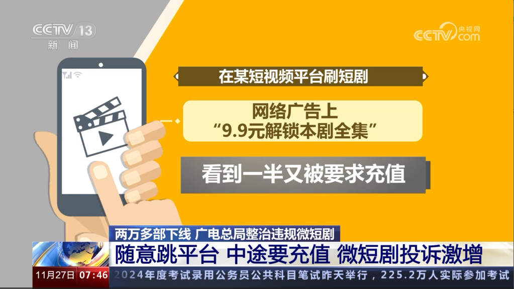 兩萬(wàn)多部下線 廣電總局整治違規(guī)微短劇 隨意跳平臺(tái) 中途要充值 微短劇投訴激增