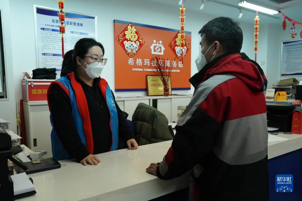 1月16日,在北京市海淀區(qū)中關(guān)村街道希格瑪社區(qū)服務(wù)站,社區(qū)工作人員(左)與快遞員交流。
