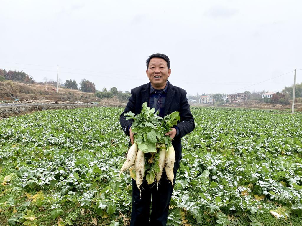 在橋頭河鎮(zhèn)新塘村,陽(yáng)加軍向記者展示剛拔出的蘿卜。新華社記者柳王敏 攝