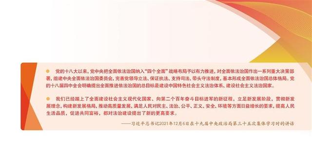 堅(jiān)持目標(biāo)導(dǎo)向,加快建設(shè)法治中國(guó)。在全面建設(shè)社會(huì)主義現(xiàn)代化國(guó)家新征程上,要按照黨中央提出的目標(biāo)和部署,分步有序推進(jìn)法治中國(guó)建設(shè)。到2025年,黨領(lǐng)導(dǎo)全面依法治國(guó)體制機(jī)制更加健全,以憲法為核心的中國(guó)特色社會(huì)主義法律體系更加完備,職責(zé)明確、依法行政的政府治理體系日益健全,相互配合、相互制約的司法權(quán)運(yùn)行機(jī)制更加科學(xué)有效,法治社會(huì)建設(shè)取得重大進(jìn)展,黨內(nèi)法規(guī)體系更加完善,中國(guó)特色社會(huì)主義法治體系初步形成;到2035年,法治國(guó)家、法治政府、法治社會(huì)基本建成,中國(guó)特色社會(huì)主義法治體系基本形成,人民平等參與、平等發(fā)展權(quán)利得到充分保障,國(guó)家治理體系和治理能力現(xiàn)代化基本實(shí)現(xiàn)。