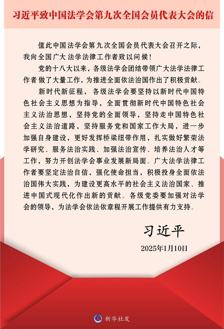 中國法學(xué)會(huì)第九次全國會(huì)員代表大會(huì)10日上午在京開幕,會(huì)上傳達(dá)習(xí)近平致信。