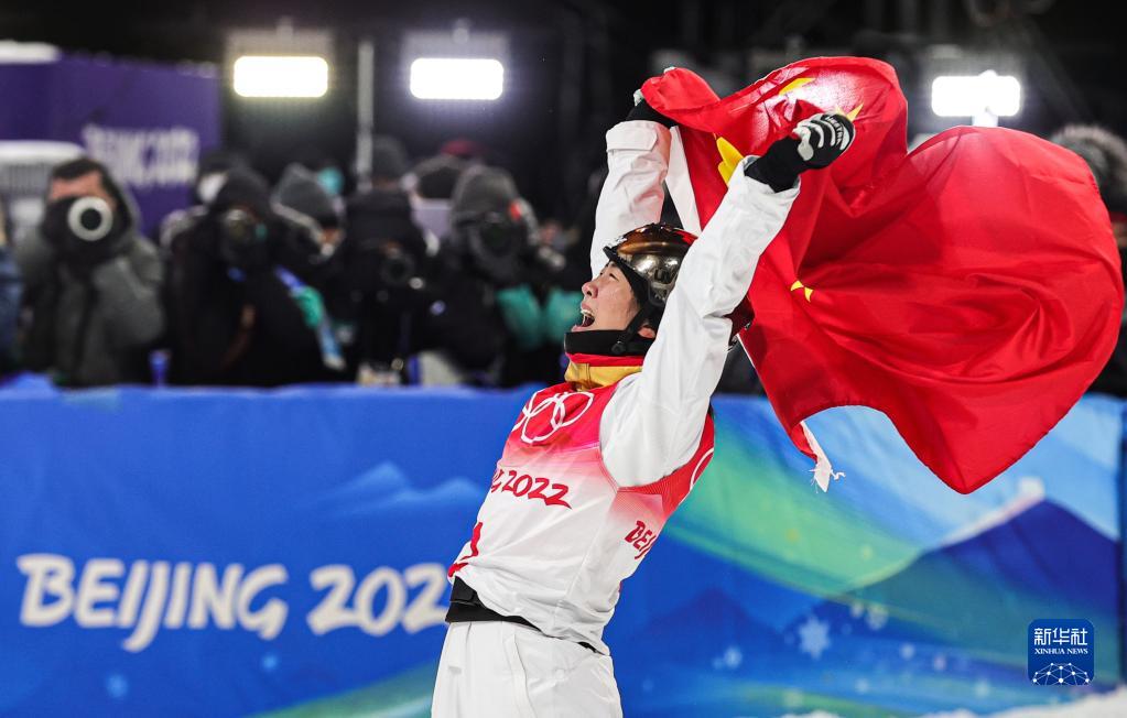 徐夢(mèng)桃在張家口云頂滑雪公園舉行的北京2022年冬奧會(huì)自由式滑雪女子空中技巧決賽奪冠后慶祝(2022年2月14日攝)。新華社記者 吳壯 攝