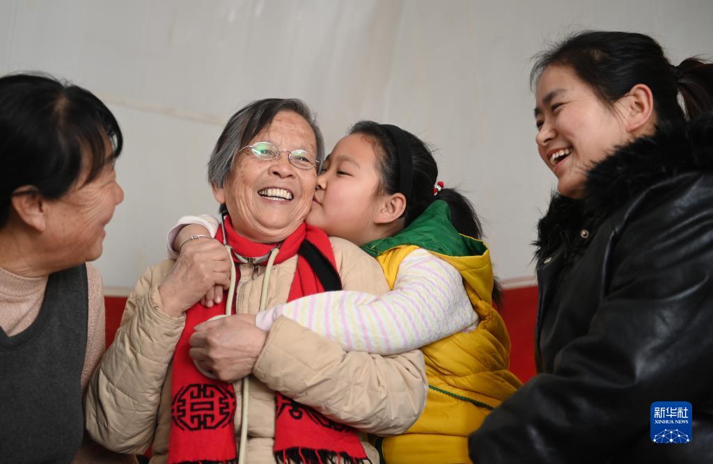 路生梅(左二)在陜西佳縣佳州街道凌云社區(qū)義診時(shí),張宇旋親密擁抱她(2021年1月17日攝)。張宇旋的媽媽(右一)、奶奶(左一)都曾讓路生梅看過(guò)病。新華社記者 陶明 攝