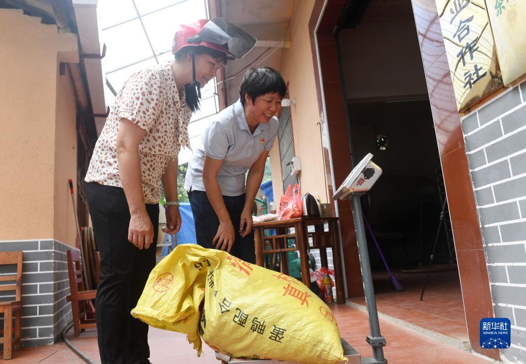 在廣西蒼梧縣六堡鎮(zhèn)山坪村,祝雪蘭(右)和村民一起稱剛采回來(lái)的茶葉重量(2022年9月22日攝)。新華社記者 陸波岸 攝