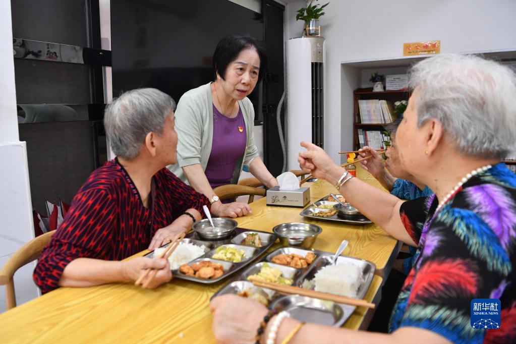 在福建省福州市軍門(mén)社區(qū)長(zhǎng)者食堂內(nèi),林丹(左二)與用餐的老人交流(2022年9月9日攝)。新華社記者 姜克紅 攝