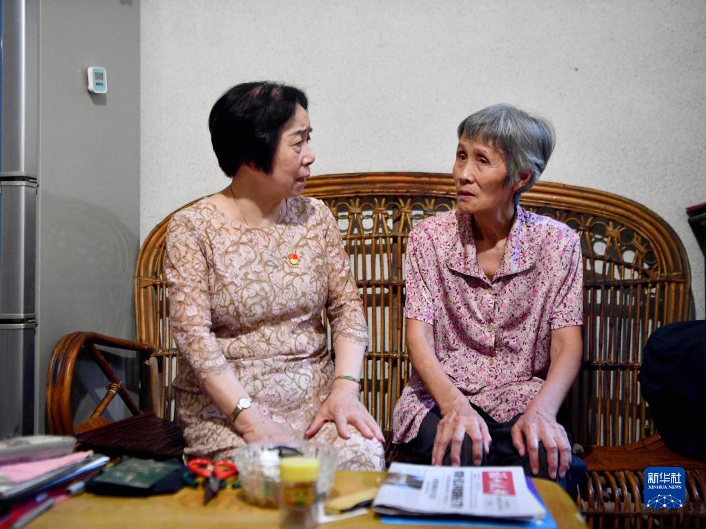福建省福州市軍門(mén)社區(qū)黨委書(shū)記林丹(左)在居民高珠英家走訪,了解老人生活情況(2022年9月15日攝)。新華社記者 姜克紅 攝