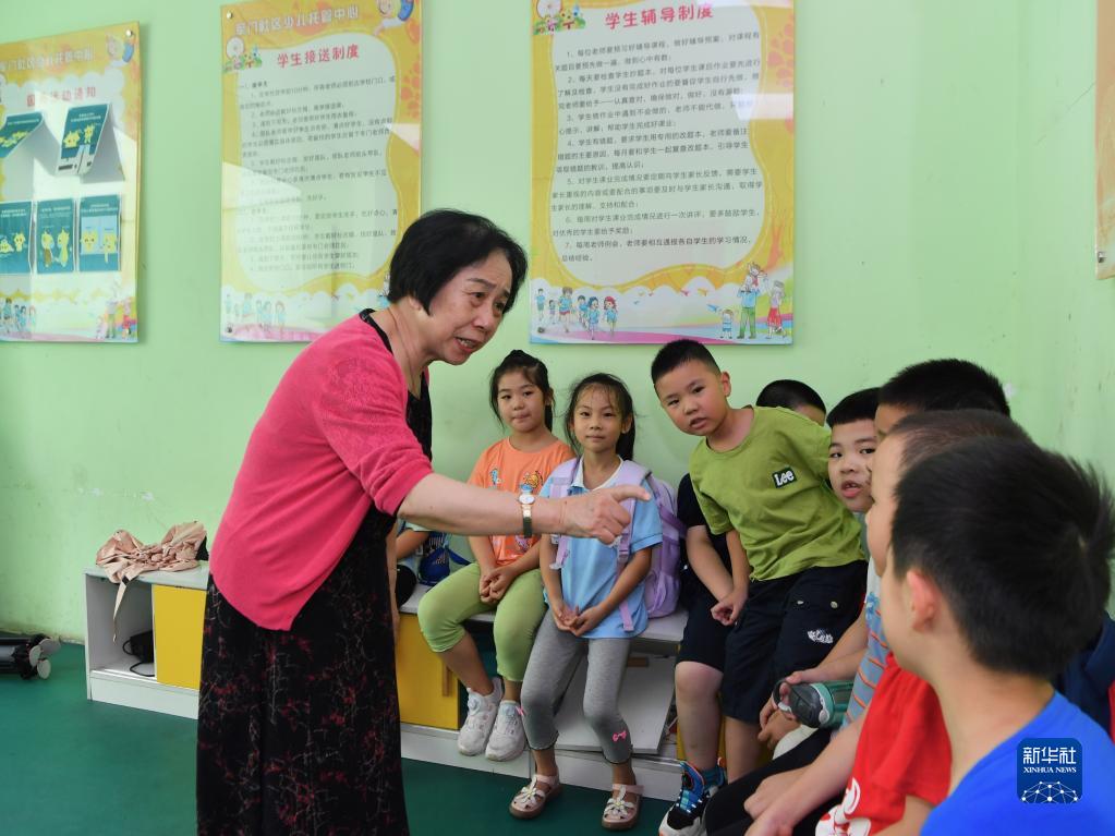 在福建省福州市軍門(mén)社區(qū)少兒托管中心,林丹與放學(xué)歸來(lái)的孩子們交流(2022年9月14日攝)。新華社記者 姜克紅 攝