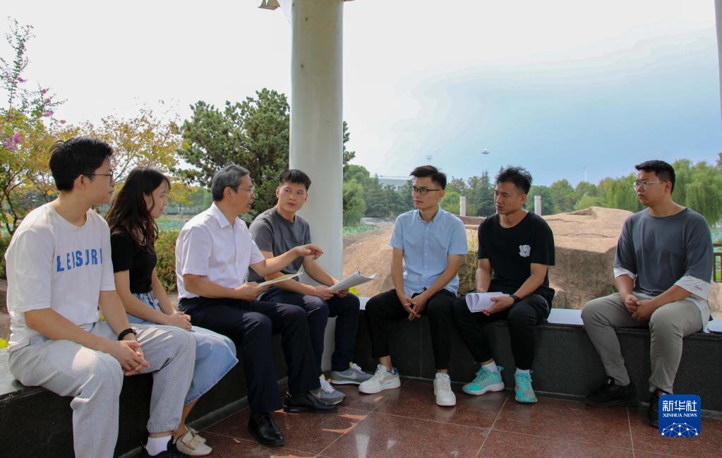 9月12日,安徽師范大學(xué)馬克思主義學(xué)院教授路丙輝(左三)與學(xué)生們在校園內(nèi)的文思亭交談。新華社記者 曹力 攝
