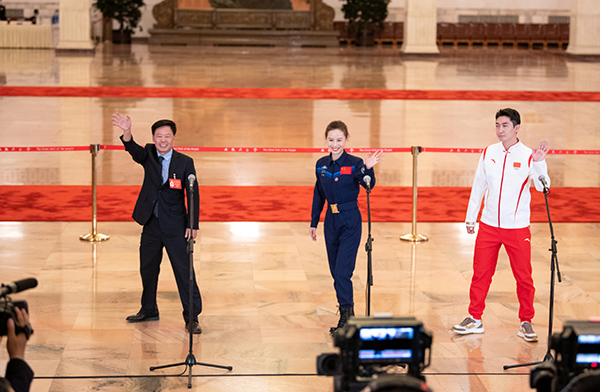 10月16日,中國共產(chǎn)黨第二十次全國代表大會(huì)在北京人民大會(huì)堂開幕。大會(huì)開幕前,舉行“黨代表通道”采訪活動(dòng)。圖為第一組走上“黨代表通道”的朱有勇、王亞平、武大靖代表(自左至右)準(zhǔn)備接受記者采訪。 本報(bào)記者 王建軍 攝