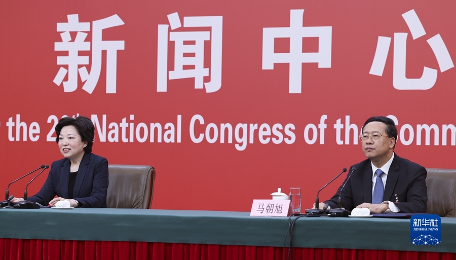10月20日,中國共產(chǎn)黨第二十次全國代表大會新聞中心舉行記者招待會。中央對外聯(lián)絡(luò)部副部長沈蓓莉,外交部黨委委員、副部長馬朝旭圍繞“習(xí)近平外交思想指引中國特色大國外交開拓前行”主題與記者交流。新華社記者 張玉薇 攝