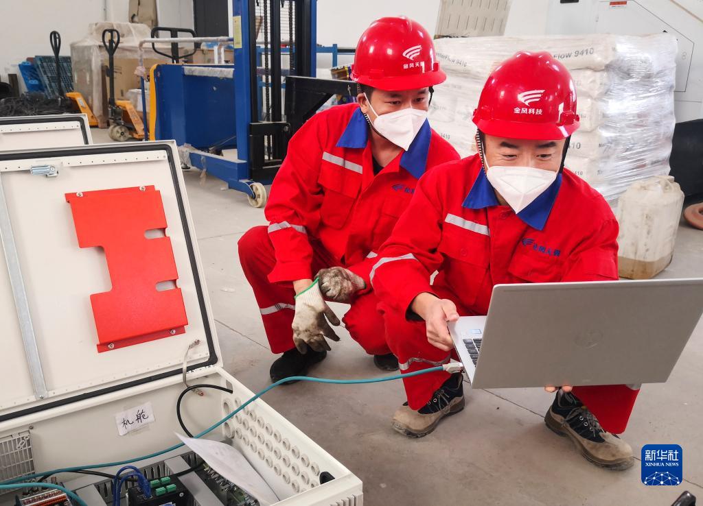 10月16日,在新疆烏魯木齊金風(fēng)科技天翼達坂城試驗風(fēng)電場,場長張新旺(右)和同事一起工作。新華社發(fā)(周凱 攝)