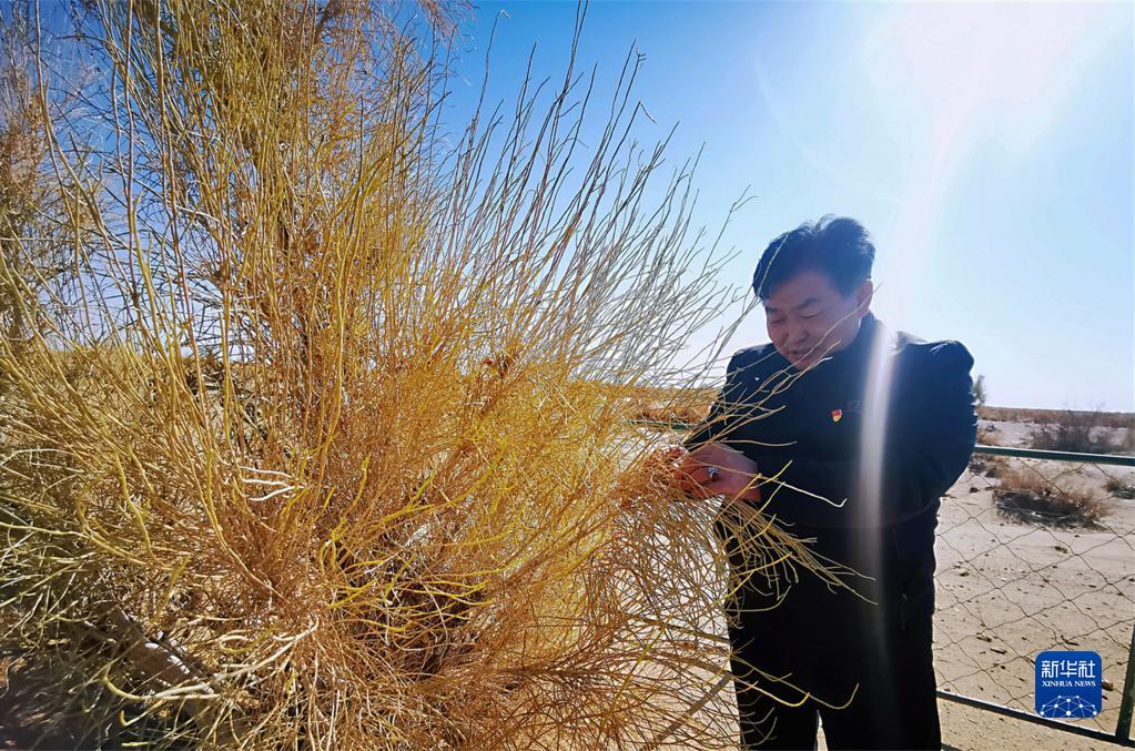 11月4日,內(nèi)蒙古巴彥淖爾市烏拉特后旗巴音查干嘎查黨支部書(shū)記寶玉查看梭梭長(zhǎng)勢(shì)。新華社記者 李云平 攝