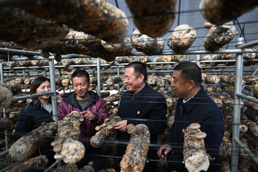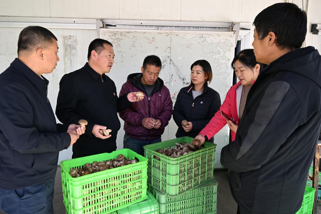 顧瑞利(右二)從北京返回村后到食用菌大棚了解香菇長勢(shì)。