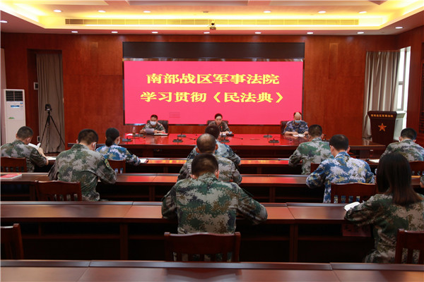 南部戰(zhàn)區(qū)軍事法院召開專題黨委會(huì),認(rèn)真學(xué)習(xí)習(xí)近平主席在中央政治局第二十次集體學(xué)習(xí)時(shí)的重要講話、全國法院學(xué)習(xí)貫徹2020年全國兩會(huì)精神視頻會(huì)議精神和民法典,專題部署推動(dòng)戰(zhàn)區(qū)兩級(jí)軍事法院和轄區(qū)部隊(duì)民法典學(xué)習(xí)宣傳貫徹工作,要求戰(zhàn)區(qū)兩級(jí)軍事法院在學(xué)習(xí)宣傳貫徹民法典中走在前列,為部隊(duì)和官兵樹好標(biāo)桿;準(zhǔn)確理解和把握民法典立法精神、條文含義和最新內(nèi)容,提高運(yùn)用民法典維護(hù)官兵權(quán)益、化解矛盾糾紛、促進(jìn)部隊(duì)和社會(huì)和諧穩(wěn)定的能力;把深入宣傳貫徹民法典作為當(dāng)前和今后一個(gè)時(shí)期的工作重點(diǎn),在戰(zhàn)區(qū)部隊(duì)營造尊法學(xué)法守法用法的濃厚氛圍。