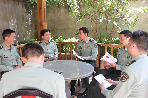 圖為官兵學(xué)習(xí)討論民法典。(南部戰(zhàn)區(qū)軍事法院供圖)