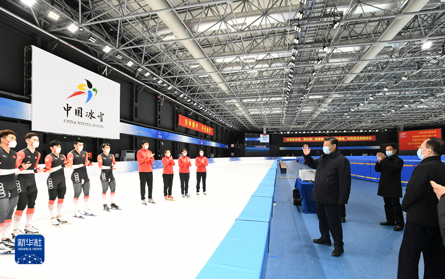 1月4日,中共中央總書(shū)記、國(guó)家主席、中央軍委主席習(xí)近平在北京考察2022年冬奧會(huì)、冬殘奧會(huì)籌辦備賽工作。這是4日下午,習(xí)近平在二七廠冰雪項(xiàng)目訓(xùn)練基地速滑館,向參訓(xùn)運(yùn)動(dòng)員、教練員表示慰問(wèn)。新華社記者 謝環(huán)馳 攝