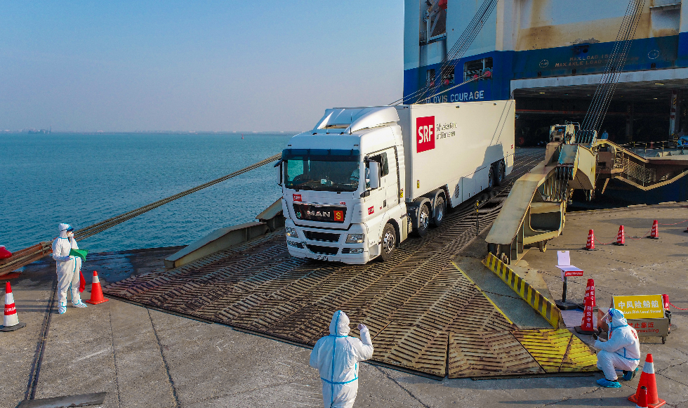 1月15日上午,載運(yùn)著6輛北京冬奧會(huì)轉(zhuǎn)播車的韓國(guó)籍“現(xiàn)代英勇”輪靠泊天津港。本票冬奧物資由天津出入境邊防檢查總站東港邊檢站完成快速入境查驗(yàn)后,將直接運(yùn)送至北京冬奧場(chǎng)館。