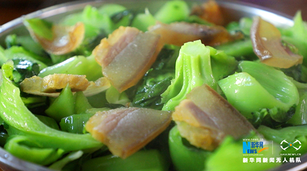 臘肉肉質(zhì)光亮有澤,呂田大芥菜炒臘味是過年招待客人的首選菜品之一。新華網(wǎng)發(fā)(羅素玲 攝)