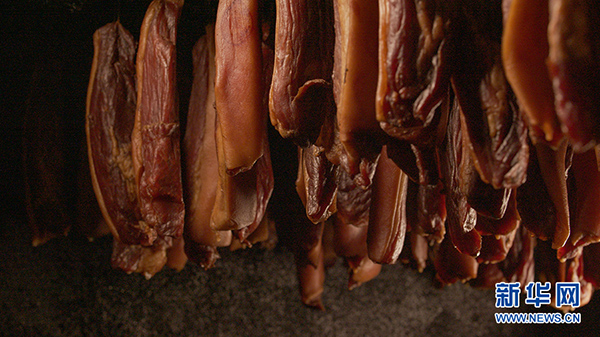 在炕房現(xiàn)場(chǎng),分上中下三層懸掛的臘肉,可以充分吸收青杠木燃燒過程中的香味。新華網(wǎng) 翟亦平 攝