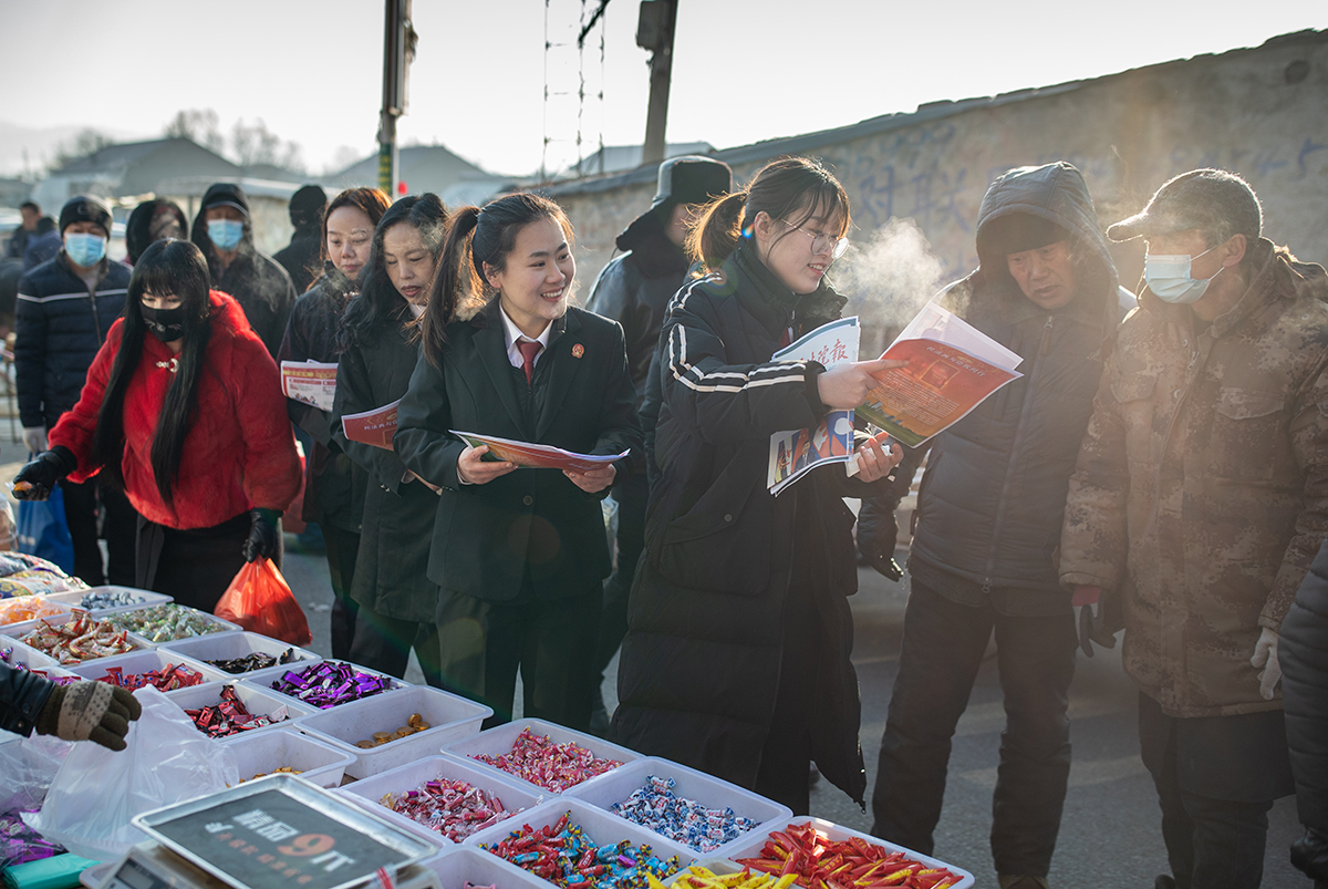 1月28日,吉林省四平市鐵東區(qū)葉赫滿族鎮(zhèn)年前最后一個(gè)大集,四平市中級(jí)人民法院工作人員向群眾發(fā)放民法典宣傳單。