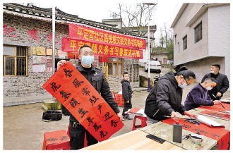 圖為蘭俊(左一)展示為村民書寫的春聯(lián)。
