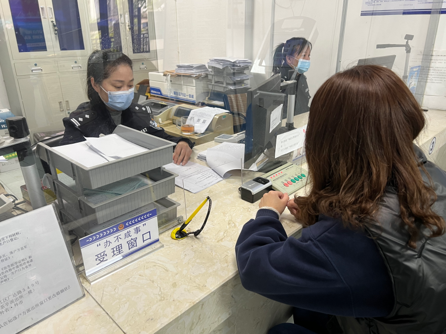 圖為在鰲峰派出所“辦不成事”受理窗口,鄭繡繽(左)正在仔細(xì)查閱核對(duì)張女士的戶籍申請(qǐng)材料。