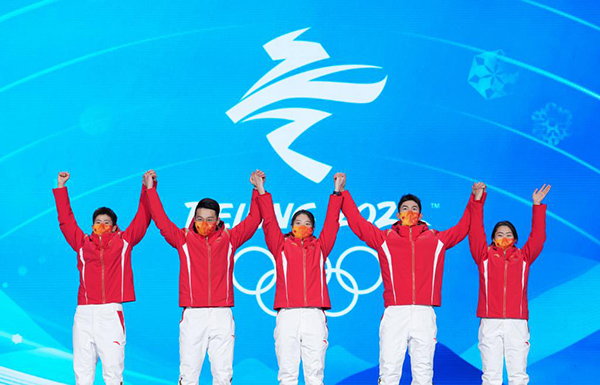 2月6日,中國隊(duì)選手范可新、任子威、曲春雨、武大靖、張雨婷(從左至右)在北京2022年冬奧會短道速滑混合團(tuán)體接力獎(jiǎng)牌頒發(fā)儀式上。新華社記者鞠煥宗攝