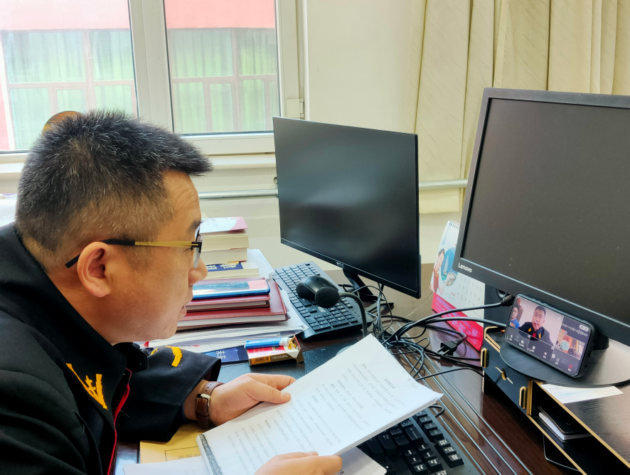 臘月二十八,《法治日?qǐng)?bào)》記者來(lái)到了青海省西寧市城北區(qū)法院廿里鋪法庭。此時(shí)法庭庭長(zhǎng)張永平正身著法袍,坐在辦公室內(nèi),對(duì)著手機(jī)調(diào)解一起糾紛。原被告雙方代理人也同時(shí)出現(xiàn)在手機(jī)屏幕中。