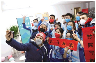 春節(jié)期間,北京冬奧會(huì)延慶賽區(qū)冬奧村里張燈結(jié)彩,志愿者和各代表團(tuán)成員相聚一堂,慶祝歡樂祥和的春節(jié)。圖為塞爾維亞代表團(tuán)成員和志愿者在延慶冬奧村合影留念。新華社發(fā) 肖紹雯 攝