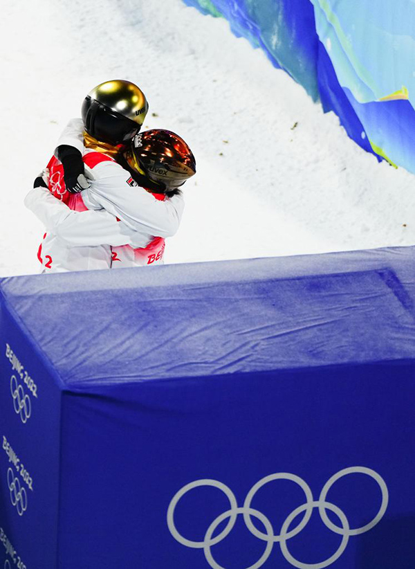 2月10日,中國隊(duì)選手徐夢(mèng)桃(右)和賈宗洋在北京2022年冬奧會(huì)自由式滑雪空中技巧混合團(tuán)體決賽比賽后擁抱。新華社記者許暢攝