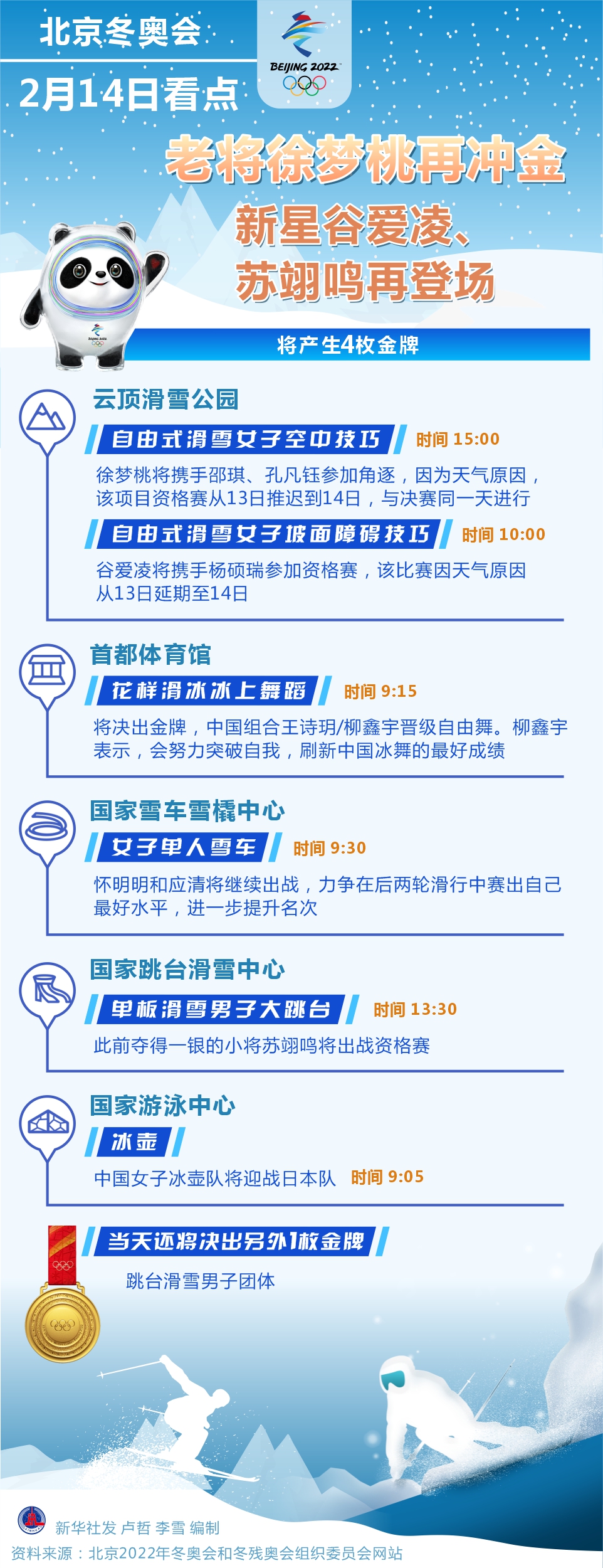 新華社北京2月13日電(記者張澤偉、王恒志)因?yàn)樘鞖庠?,北京冬奧會(huì)部分項(xiàng)目調(diào)整了賽程,14日將產(chǎn)生4枚金牌。在自由式滑雪女子空中技巧項(xiàng)目上,中國(guó)隊(duì)實(shí)力不俗,“四朝元老”徐夢(mèng)桃將再次向金牌發(fā)起沖擊。冰舞和雪車項(xiàng)目,中國(guó)選手則將力爭(zhēng)取得突破。